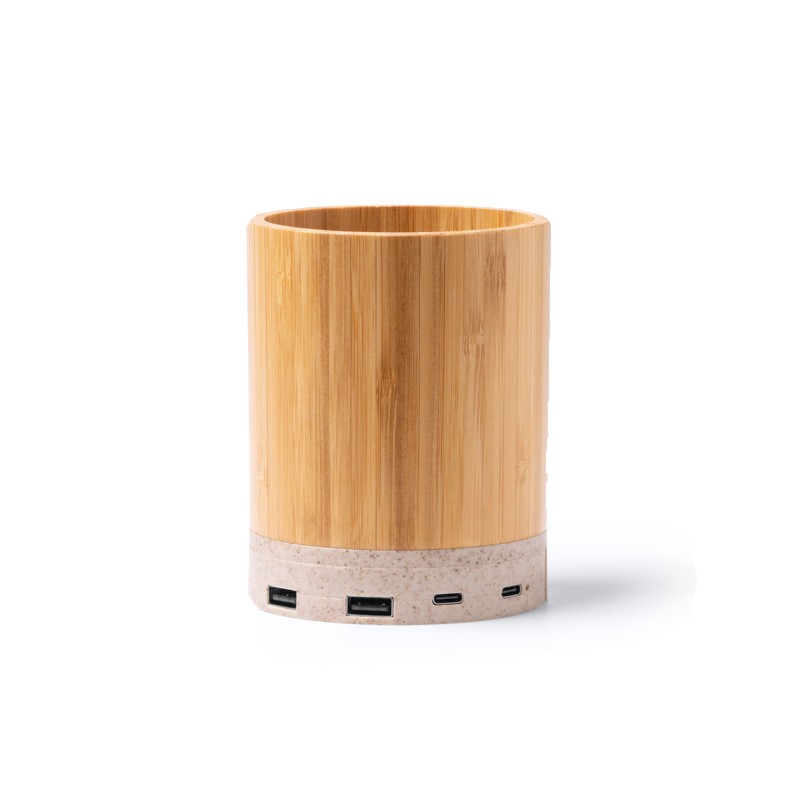 Porte-crayon avec structure principale en bambou et base avec fonction de chargeur sans fil en fibre de blé. Sortie 15 W. Port USB intégré dans la base avec deux ports de sortie de type C et deux ports de sortie USB. Présentation en boîte écodesign.